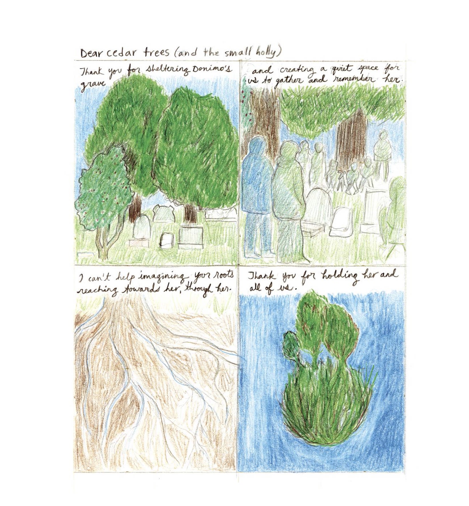 Donimo had a green burial and now rests beneath two cedars and a holly tree.