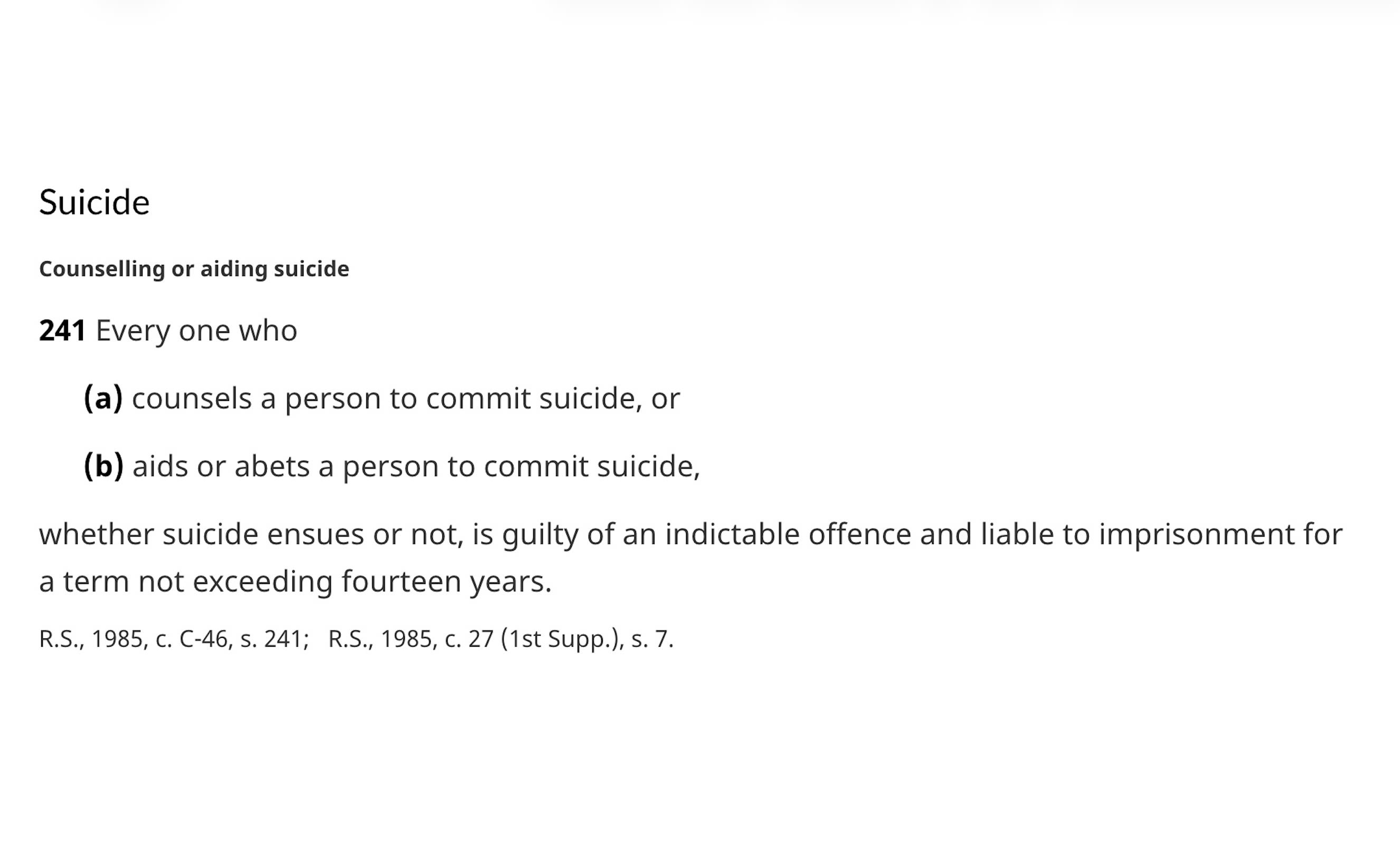 Prior to 1972, when Canada decriminalized suicide, he said, a person could be persecuted for attempting to end their own life. Then, while suicide was legal for the sole person attempting, any person assisting, regardless of motives, could be guilty of murder or manslaughter.